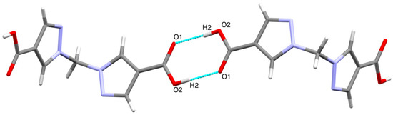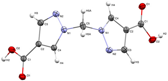 Recently, we have developed a universal approach for the synthesis of a new series of bis(pyrazol-1-yl)alkane-4,4′-dicarboxylic acids starting from the commercially available pyrazole-4-carboxylic acid [15]. Taking into account the potential of these compounds as supramolecular building block, biologically active substances, monomers for polyesters and polyamides, we have studied the crystal structure and supramolecular analysis of N-heterocyclic compound titled bis(pyrazol-1-yl)methane-4,4′-dicarboxylic acid (H2bpmdc). This dicarboxylic acid was synthesized recently in our group and was characterized by NMR and IR spectroscopy, thermal and elemental analyses [15]; however, its crystal structure determination has not been performed yet.