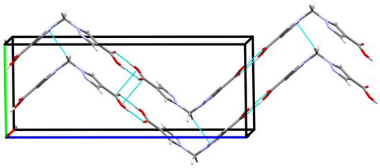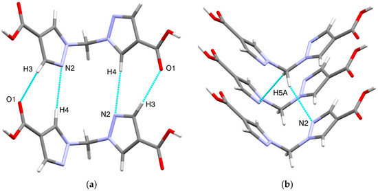 Other types of intermolecular interactions include CH···N and CH···O short contacts (Figure 3a) with the distances of 2.62(1) and 2.88(1) Å, correspondingly, CH–π interactions between CH2 groups and pyrazole rings (d(N2-H5A) = 2.716(7) Å, Figure 3b) and carbonyl–carbonyl interactions, d(C1-O2) = 3.170(1) A (Figure 3c). Hydrogen bonds link the H2bpmdc molecules into zig-zag chains oriented along the crystallographic axis c, while the above-mentioned interactions join the chains into supramolecular stacks along the axis b (Figure 4). Selected geometric parameters of H2bpmdc are listed in Table 1.