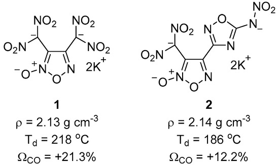 Keeping in mind the desired synthesis of high-energy materials with an increased oxygen content, it seems promising to combine the furoxan cycle and the dinitromethyl functionality in one molecule. Recently, energetic dinitromethylfuroxan potassium salts 1 [24] and 2 [25] exhibiting high densities and thermal stability, as well as a positive oxygen balance to CO, were synthesized (Figure 2). However, both of these substances are highly sensitive to mechanical stress. Therefore, the goal of this work includes the synthesis of energy-rich potassium 4-dinitromethyl-3-methylfuroxanate 3, which will also have a high oxygen content, but due to the presence of a methyl group, it may turn out to be less sensitive to impact and friction.