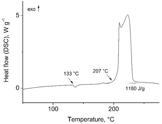 A set of important physicochemical properties of the potassium salt 3 was also established (Table 1). It was found that compound 3 has a remarkably high density (1.91 g cm−3), zero oxygen balance (to CO) and quite high combined nitrogen-oxygen content (62.8%). Under linear heating at 5 K min−1 rate, sample 3 first shows a phase transition at 133 °C with the following thermal decomposition after 207 °C (Figure 3). Hence, with this preliminary estimate of thermal stability, compound 3 could be placed in between known dinitromethylfuroxan derivatives 1 and 2. At the same time, the mechanical sensitivity of synthesized 3 is beneficially less than for previous synthesized salts 1 and 2 (Table 1). Impact sensitivity of 3 is on the level of nitramines (see RDX, Table 1), whereas the friction sensitivity of 3 approaches the nitroester’s level (see PETN, Table 1).