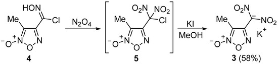 A synthetic route to the target compound 3 is based on one-pot transformations of the readily available (furoxanyl)chloroxime 4, which was previously synthesized by our research group from ethyl acetoacetate [26]. We found that nitration of substrate 4 using an excess of N2O4 followed by a one-pot reduction in the intermediate gem-chlorodinitrofuroxan 5 upon its treatment with KI afforded potassium salt 3 in an overall yield of 58% (Scheme 1). The structure of the furoxanate 3 was confirmed by elemental analysis, IR, 1H, 13C and 14N NMR spectroscopy. The 13C NMR spectrum showed four signals of carbon atoms: Me group (8.0 ppm), characteristic signals of C-3 and C-4 carbons of the furoxan ring (113.7 and 152.6 ppm, respectively) and a broadened signal of the C(NO2)2 functionality (123.3 ppm). The presence of the C(NO2)2 moiety was additionally confirmed by 14N NMR spectroscopy (characteristic signal at −23.5 ppm).