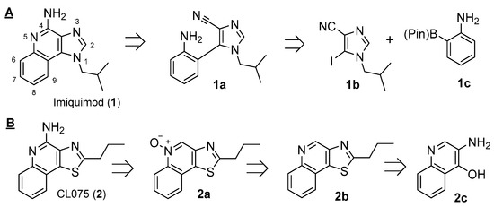 Synthetic strategies to arrive at the 4-amino imidazoquinolines (A) and thiazoloquinolines (B).