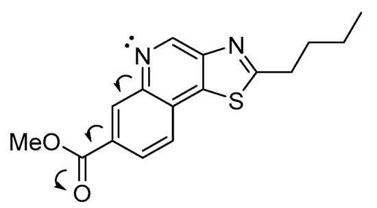 The ability to strategically substitute thiazoloquinolines (such as CL075) is critical to establishing the limits of activity and utility of this scaffold as a nucleoside base mimic or as a TLR7 and TLR8 agonist. Prior work has shown that the addition of an ester to the C7 position of 4-amino-imidazoquinolines dramatically impacts the activity of these compounds [6]. Our initial attempts to install an ester to the 4-amino-thiazoloquinoline scaffold (2) followed the existing synthetic route outlined in Figure 1B. As noted above, this approach failed to yield the 5N-oxide intermediate which we attribute to the inductive effect of the acyl group in the C7 position (as depicted in Figure 2). Given the lack of literature precedence to support the standard pathway in the presence of electron-withdrawing groups, we developed an alternative route to functionalize these compounds that utilizes palladium-catalyzed alkoxy carbonylation to acylate the C7 position [8].