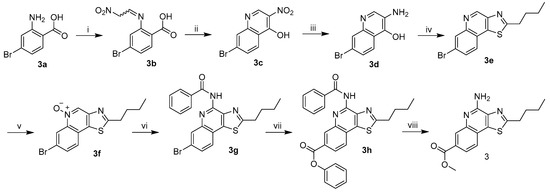 The procedure described in Scheme 1 begins with the installation of a bromo group into thiazoloquinoline using a modified Niementowski reaction to produce the desired 3-amino-4-hydroxy-7-bromoquinoline (3d) [9,10]. Cyclization to the 7-bromo-thiazoloquinoline (3e) was achieved by first forming the primary amide at the 3-amino position, followed by dehydration using phosphorous pentasulfide in pyridine. Oxidation of the N5 position using 3-chloroperbenzoic acid in dichloromethane in the presence of the C7-bromo group proceeded smoothly and the N5-oxide (3f) was obtained in 93% yield (with no evidence of the N3 oxidation product). The weaker deactivating effect of the halogen, as compared with the acyl group, was easily overcome in this case by using additional equivalents (3.5) of the peroxide. The 4-amino group was installed as a benzamido surrogate via a 1,3-dipolar cycloaddition reaction using dipolarophile benzoyl isocyanate, with carbon dioxide being released as a byproduct. The final product was obtained in a two-step sequence that generates the C7-phenyl ester using Pd2(dba)3 with XantPhos as the catalyst for alkoxycarbonylation, followed by acid-catalyzed hydrolysis and transesterification in methanol to yield the target compound 3 in 10.8% yield.