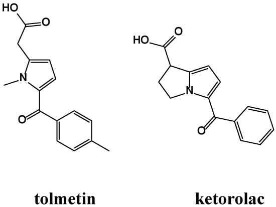 Pyrrole derivatives comprise an important class of heterocyclic compounds with a broad range of pharmaceutical applications [10], including antioxidant [11] and anti-inflammatory [12,13,14,15] activities. Two examples are the commercially available anti-inflammatory drugs tolmetin (Tolectin®) and ketorolac (Toradol®, Ketolac®), as shown in Figure 1.