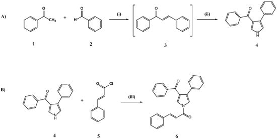 (A) One-pot synthesis of phenyl(4-phenyl-1H-pyrrol-3-yl)methanone (4). (i) LiOH.H2O, EtOH absolute, rt, 6 h. (ii) LiOH.H2O, p-toluenesulfonylmethyl isocyanide (TosMIC), rt, 17 h, yield 43% (B) Synthesis of (E)-1-(3-benzoyl-4-phenyl-1H-pyrrol-1-yl)-3-phenylprop-2-en-1-one (6). (iii) Et3N, 4-(dimethylamino)-pyridine (DMAP), dry CH2Cl2, Ar, rt, 24 h, yield 51%.