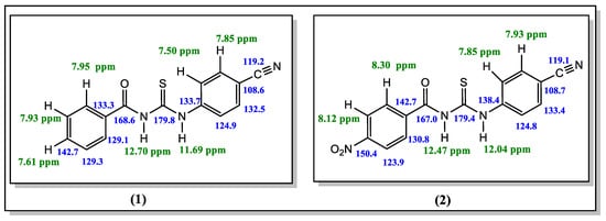 The 1H-NMR spectrum of the title compounds indicate that the synthesized structures are aroyl thioureas derivatives. The signals that appeared at δH 12.70, 11.69 ppm and 12.47 and 12.04 ppm are characteristic of the N-H protons of the thiourea moiety for the title compounds 1 and 2, respectively [22]. There are multiple signals at δH 7.50–8.30 ppm which corresponds to the aromatic protons on phenyl rings in 1 and 2. The chemical shifts of the hydrogen atoms on the benzene and cyano-benzene rings are in a lower field than that of the nitro-benzene ring (Figures S3 and S4).