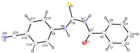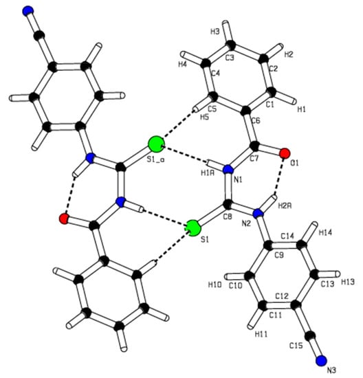 The title compounds have been synthesized and characterized by elemental analysis, FT-IR as well as 1H- and 13C-NMR spectroscopic methods. The molecular structure of compound 1 due to the obtained crystals was determined by a single-crystal X-ray diffraction study. All expected frequencies of the ν (N-H), ν(C≡N), ν(C=O), ν(C=N) and ν(C=S) were observed in the infrared spectra of the title compounds. The FT-IR data show the important stretching bands for ν(N-H) and ν(C=O) at 3229 and 1662 cm−1 for compound 1 and 3212 and 1675 cm−1 for the compound 2, respectively, (Figures S1 and S2) [17]. The lower force constant of the (C=O) stretching modes found for the title compounds is related to the conjugated resonance with the phenyl ring as well as the intra-molecular C=O…H—N hydrogen bond, compared with the ordinary carbonyl absorption (~1710 cm−1). The stretching frequencies observed at 2223 and 2225 cm−1 for the title compounds confirm that the C≡N functional group is located on the other side of the aromatic ring, respectively [18]. In addition, strong bands observed at 1518 and 1514 cm−1 for the title compounds, respectively, highlight the presence of the stretching vibration of thiouredio moiety (νN-CS-N). A strong band at 1262.9 and 1262.5 cm−1 are assigned as stretching vibration bands of the thiocarbonyl group (C=S) for the title compounds, respectively [19]. The medium intensity IR absorption bands observed 834 and 854 cm−1 for the title compounds are assigned to the ν(C=S) mode of the thiourea derivatives. The formation of C=S…H- intermolecular hydrogen bonds seem to strongly affect the frequency of the (C=S) mode [20,21]