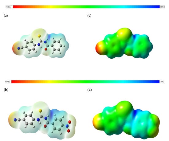 Molecular electrostatic potential map calculated at B3LYP/6-311G(d,p) level for the title compounds 1 (a,c) and 2 (b,d).