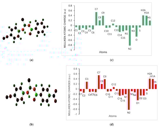 (a,b) The Mulliken charges (in a.u.) of the C, O, N, S, and some H atoms for the title compounds 1 and 2 were calculated by DFT B3LYP/6-311G (d,p) basis set; (c,d) The graphical representation of Mulliken atomic charge distributation in the title compounds 1 and 2, respectively.