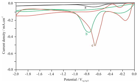 Cyclic voltammograms obtained in 0.1 M LiClO4 acetonitrile solution at a scan rate of 0.01 V/s for (a) only, (b) 0.004 M compound 1, (c) 0.004 M compound 2.