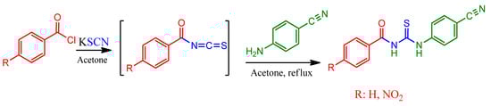 N-(aroyl/acyl)-N′-substituted-(aryl/alkyl)-thiourea derivatives are known to exhibit a wide variety of biological activities such as antibacterial and antifungal properties and regulating activities for plant protection in agriculture [1,2,3]. In addition, some of them have been used as ligands in the extraction, separation, and determination of heavy metals such as Fe and Zn ions [4,5]. These types of ligands have been used as a chemosensor for anions such as F−, CN−, OAc−, etc., and as a potentiometric sensor for heavy metals in analytical applications [6,7]. Aroylthiourea derivatives with different substituents have been successfully employed in environmental control as ion-selective electrodes [8,9]. Furthermore, the synthesis of biologically important heterocyclic scaffolds, such as thiohydantoins has also been used some arylthiourea derivatives [10]. Additionally, some aroylthioureas were used in the synthesis of benzoylaminoimidazolone and aminoimidazolone derivatives [11], bicyclic 2-aminothiazolyl compounds [12] and some tetrazoles and guanidines [13].