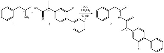 An easy and handy synthetic procedure for amide synthesis is through N,N′-dicyclohexylcarbodiimide (DCC)-mediated coupling between amines and carboxylic acids (Scheme 1). DCC is a dehydrating agent commonly used for the preparation of esters, anhydrides, and amides. The mechanism of DCC is to activate the carboxylic acid (flurbiprofen 2) to the nucleophilic amphetamine 1. This reaction generally works in high yield.
