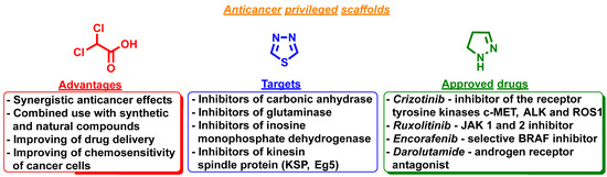 The small molecules containing substituted pyrazoline and 1,3,4-thiadiazole scaffolds are the leading objects in the modern anticancer agent drug design and present the important groups of anticancer drugs (Figure 1) [9,10,11]. Pyrazoline-based molecules are available in the pharmaceutical market as approved drugs targeted at different types of cancer diseases: crizotinib—inhibitor of the receptor tyrosine kinases c-MET, ALK and ROS1 [12,13,14]; ruxolitinib—JAK 1 and 2 inhibitor [15,16]; encorafenib—selective BRAF inhibitor (BRAFi) [17]; darolutamide—androgen receptor (AR) antagonist [18]. 1,3,4-Thiadiazole derivatives demonstrate in vitro and/or in vivo efficacy across the cancer models [19,20] and are currently at different stages of clinical trials as prospective inhibitors of carbonic anhydrase [21], glutaminase [22], inosine monophosphate dehydrogenase [23], and kinesin spindle protein (KSP, Eg5) [24]. In the last two decades, the number of reports describing and supporting dichloroacetic acid (DCA) employment against some cancer types has increased [25]. Currently, DCA and some bioisosteres are intensively studied and evaluated in the synergistic conditions/experiments with other anticancer agents of synthetic and natural origin for the optimization of anticancer potency [25,26].