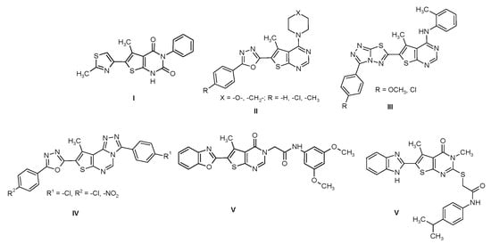 Likewise, numerous articles have been published in the last decade about the antimicrobial activity of 6-heterylthieno[2,3-d]pyrimidines with unsubstituted position 2 [4,5,6,7] (II-V) (Figure 1), some of them containing fused systems of heterocycles such as 1,2,4-triazolo[3,4-b]1,3,4-thiadiazole (III) [5] or 1,3-benzoxazole (V) [7]. One of the latest works published was devoted to the study of the antimicrobial activity of 6-heteryl-5-methyl-2-thiothieno[2,3-d]pyrimidines, which can possibly act as inhibitors of bacterial TrmD VI (Figure 1) [8].