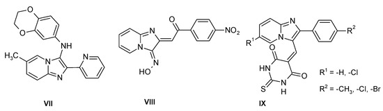 Several imidazo[1,2-a]pyridine derivatives were reported as compounds with antimicrobial properties which may be useful against parasites of the Leishmania genus (VII) (Figure 2) [9]; this heterocyclic system is the core structure of savolitinib [10], a mesenchymal epithelial transition factor (MET) inhibitor recently approved in China after the results of a pivotal phase II trial in patients with NSCLC/pulmonary sarcomatoid carcinoma [11]. This fragment is also a part of the innovative drug olprinone, which is a selective phosphodiesterase 3 (PDE3) inhibitor [12]. Imidazo[1,2-a]pyridines were also reported as antiproliferative agents [13], α-glucosidase inhibitors [14] and antimicrobials (VIII) (Figure 2) [15]; some of these compounds have shown promising antibacterial activity against S. pyogenes, P. aeruginosa and S. aureus (IX) (Figure 2) [16].