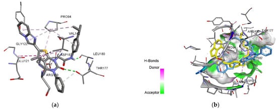 3-D visualization: (a) interaction of the ligand 4.2 with amino acids of the active site of TrmD; (b) conformational pose of the reference inhibitor (yellow molecule) [19] and the ligand 4.2 (blue molecule) in the active site of P. aeruginosa TrmD.