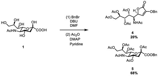 The precursor to the title compound 4 formed as a significant by-product during the attempted synthesis of peracetylated benzyl ester of Neu5Ac 5, a versatile intermediate, used for further modification of Neu5Ac (Figure 2). This was carried out as described previously in the literature [10]. Thus, Neu5Ac was treated with DBU and benzyl bromide in DMF, anticipating only the isolation of the benzyl ester of Neu5Ac.