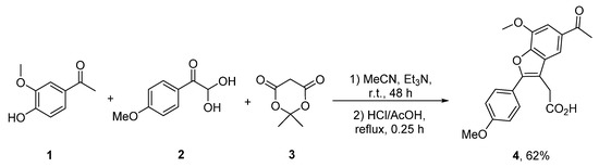 In the present paper, we describe a multicomponent reaction of acetovanillone 1, 4-methoxyphenylglyoxal 2 and Meldrum’s acid 3 leading to 2-(5-acetyl-7-methoxy-2-(4-methoxyphenyl)benzofuran-3-yl)acetic acid 4 unknown in the literature (Scheme 1). It was shown that the studied reaction was a one-pot telescoped two stage process. The first step involves the condensation of the starting components in acetonitrile in the presence of triethylamine. Note that the initial stage of the process can be carried out under mild conditions at room temperature due to the high solubility of acetovanillone 1. In this case, the reaction proceeds rather slowly, and a complete conversion of apocynin 1 was observed in 48 h. At the same time, our attempts to accelerate the process by increasing the temperature of the first stage led to a significant decrease in the yield of the target product 4. It should be mentioned that the final step of the reaction involves intramolecular cyclization in a mixture of hydrochloric and acetic acids. As was shown previously, these conditions are optimal for the last stage of the process [18,19,20,21,22,23,24]. Thus, the presented approach allows one to obtain the target product 4 in a 62% yield.
