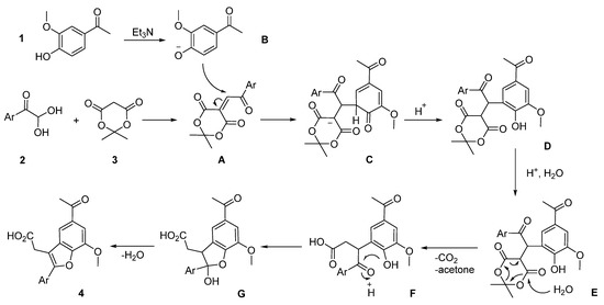 The assumed pathway of the considered reaction is shown in Scheme 2. At first, the condensation of 4-methoxyphenylglyoxal 2 with Meldrum’s acid 3 results in unstable Michael acceptor A. Then, the interaction of acetovanillone anion B with aroylmethylene derivative A leads to adduct D. At the next step, intermediate D cyclizes into γ-ketoacid F with the elimination of acetone and CO2 molecules. Finally, the target furylacetic acid 4 is formed as a result of an acid-catalyzed intramolecular cyclization of compound F.