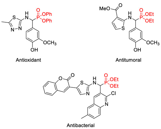 Organophosphorus compounds, especially α-aminophosphonates and their ester derivatives present a great research focus due to their wide range of pharmacological and environmental applications [1]. Being recognized as bioisosteres [2] of amino acids, α-aminophosphonates can be inhibitory agents of enzymes or receptor ligands due to the tetrahedral arrangement of these substituents around the phosphorus atom, which allows them to mimic the energetic transition state of peptide bond hydrolysis during metabolic processes [3,4]. These compounds have been shown to have excellent properties as inhibitors of GABA receptors, various proteolytic enzymes, dialkylglycine decarboxylase and peptide mimetics [5]. It is with this in mind that organic chemists are now focusing their attention on the synthesis of new models of heterocyclic aminophosphonates. These last ones, according to our research, have been evaluated and given very interesting biological activities as anticancer [6,7], antimicrobial [8], antioxidant [9] agents (Figure 1).