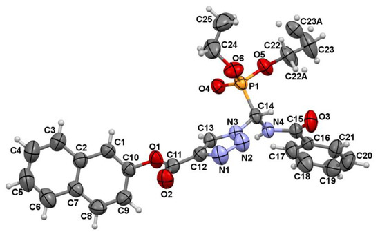 In summary, we obtained the X-ray crystal structure of the product described previsouly, the naphthalen-2-yl 1-(benzamido(diethoxyphosphoryl)methyl)-1H-1,2,3-triazole -4-carboxylate and found its structure to be characterized by disorder in the methyl linked to an ethyl attached to the phosphorus group. The three oxygen atoms and the carbon build a distorted tetrahedron surrounding the phosphorous atom. Furthermore, the naphthalene system is almost planar and makes dihedral angles.