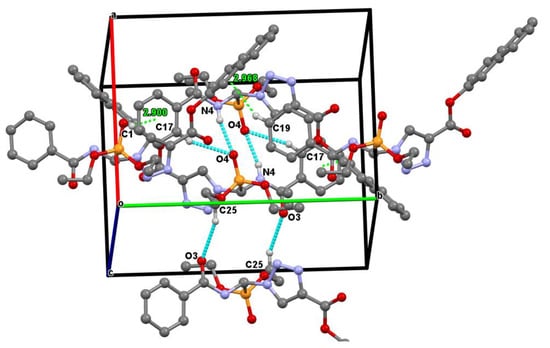 In the crystal, the molecules are interconnected through C17–H17…O4 and N4–H4A…O4 bifurcated hydrogen bonds that build dimers (Figure 4). The dimers are linked together by the C25–H25…O3 hydrogen bond, in addition to C1–H1…π and C19–H19…π interactions (See Supplementary Materials Table S2). Moreover, the molecular conformation is stabilized by a stark intramolecular hydrogen bond (C14–H14…O3) completing the S(5) ring (see Table S2).