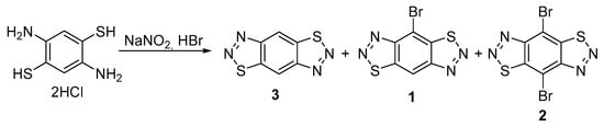 To synthesize bromoderivatives of benzo[1,2-d:4,5-d′]bis([1,2,3]thiadiazole) Fachetti et al. studied the nitrosation of 2,5-diaminobenzene-1,4-dithiol in hydrobromic acid [8]. As a result of this reaction, a mixture of three compounds was formed—tricycle 3, its 4-mono- 1 and 4,8-bis-bromo 2 derivatives, although the authors failed to isolate and characterize individual compounds (Scheme 1).