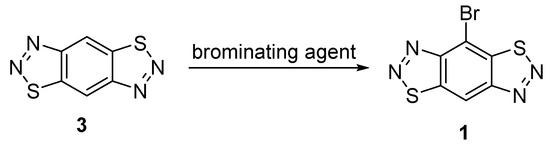 Mono-bromoderivatives of benzofused thiadiazoles are rare and difficult-to-prepare compounds, and they are important precursors for the synthesis of unsymmetrical disubstituted benzothiadiazoles [10]. Thus, the 4-bromobenzo[1,2-d:4,5-d′]bis([1,2,3]thiadiazole 1 synthesized by us can be widely explored for the preparation of previously inaccessible various photovoltaic material, such as dye-sensitized solar cells (DSSCs), organic light-emitting diodes (OLEDs), organic field effect transistors (OFETs), etc.
