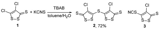 In an attempt to obtain thiocyanate derivative 3, the reaction of 4,5-dichloro-3H-1,2-dithiole-3-thione 1 with potassium thiocyanate was studied. It was found that the treatment of compound 1 with potassium thiocyanate afforded in a mixture of aromatic hydrocarbon and water in the presence of tetrabutylammonium bromide (TBAB) as a phase transfer catalyst gave a new dimer 2: dark red solid C6Cl2S7 (Scheme 1). The reaction occurred when heated; the best result was obtained in toluene/water, where the starting material disappeared after 1 h (Table 1, Entry 6) and product 2 was isolated with a high yield (73%). With longer heating in benzene, along with the disappearance of the starting dithiolethione 1, the formation of decomposition products was observed.
