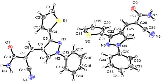 - El-Hiti, G.A.; Abdel-Wahab, B.F.; Baashen, M.; Ghabbour, H.A. Crystal structure of ethyl 5-amino-3-(methylthio)-1-(1-phenyl-5-(thiophen-2-yl)-1H-pyrazole-3-carbonyl)-1H-pyrazole-4-carboxylate, C21H19N5O3S2. Z. Kristallogr.-New Cryst. Struct. 2016, 231, 1051–1052. [Google Scholar] [CrossRef] [Green Version]