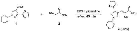 Kariuki, B.M.; Abdel-Wahab, B.F.; Mohamed, H.A.; El-Hiti, G.A. Synthesis and Structure Determination of 2-Cyano-3-(1-phenyl-3-(thiophen-2-yl)-1H-pyrazol-4-yl)acrylamide. Molbank 2022, 2022, M1372. https://doi.org/10.3390/M1372