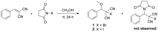 The difunctionalization of olefins has become an attractive strategy for rapidly increasing molecular complexity from abundant and cheap feedstock [1,2,3,4]. Up to now, much work on difunctionlization has been reported, such as the representative aminohalogenation reaction, which provides an effective platform to convert simple olefins [5,6,7], α, β-unsaturated ketones [8,9,10], and β-nitrostyrene derivatives [11,12,13] into vicinal haloamine compounds. β, β-Dicyanostyrene derivatives are a kind of reaction raw material containing a multifunctional group which can be converted into the skeleton structures in drugs and natural products, via difunctionalization, such as enamine [14], β-hydroxy sulfide [15], dicyanocyclobutane [16], and so on. Recently, an unexpected vicinal bromoether product was obtained when we performed an aminobromination reaction of β, β-dicyanostyrene. On this basis, we developed a synthetic protocol for vicinal haloethers, including 2-bromo-2-(methoxy(phenyl)methyl)malononitrile (1) and 2-iodo-2-(methoxy(phenyl)methyl)malononitrile (2), which are verified to be novel compounds and to possess the potential to be building blocks in organic synthesis by easy conversion into amounts of useful functional derivatives via intermolecular or intramolecular nucleophilic substitution of halogens.