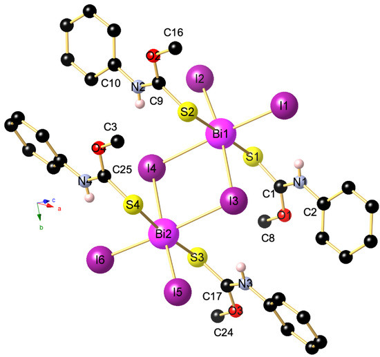 Since according to a literature survey, no Bi(III) complexes ligated by thiocarbamates have been crystallographically characterized yet, we examined the product crystallizing in the triclinic space group P by an X-ray diffraction study performed at 100 K. As shown in Figure 2, a dinuclear species has formed, in which the two crystallographically different coordinated Bi(III) centers are linked mutually through two μ2-bridging I3 and I4 iodido ligands. The Bi···Bi separation of 4.720 Å excludes any intermetallic interaction. The octahedral coordination sphere around each Bi atom is completed by two terminal iodide ligands with a mean Bi–Iterm distance of 2.924(3) Å and two trans-arranged thiocarbamate ligands. Each of the four L molecules is crystallographically different with Bi–S bond lengths varying from 2.8290(10) to 2.8952(11) Å. The mean C=S bond is slightly elongated with respect to that of non-ligated MeOC(=S)N(H)Ph (1.701(4) vs. 1.6708(11) Å) [17]. The two bridging I2 and I4 atoms are quite symmetrically bridging, the mean Bi–Ibridg bond distance of 3.225(3) Å being far longer than the Bi–Iterm one.