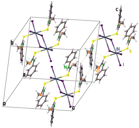 Crystal data for C32H36Bi2I6N4O4S4, M = 1848.25 g.mol−1, dark orange crystals, crystal size 0.15 × 0.113 × 0.073 mm3, triclinic, space group P, a = 12.8215(6) Å, b = 13.5748(6) Å, c = 15.1534(8) Å, α = 85.829° (2), β = 73.537(2)°, γ = 68.789(2)°, V = 2356.7(2) Å3, Z = 2, Dcalc = 2.605 g/cm3, T = 100 K, R1 = 0.0286, Rw2 = 0.0470 for 104,055 reflections with I ≥ 2σ (I) and 14,441 independent reflections. Largest diff. peak/hole/e Å−3 1.48/-1.51. Data were collected using graphite-monochromated MoKα radiation l = 0.71073 Å and have been deposited at the Cambridge Crystallographic Data Centre as CCDC 2165826. (Supplementary Materials). The data can be obtained free of charge from the Cambridge Crystallographic Data Centre via http://www.ccdc.cam.ac.uk/getstructures. The structure was solved by direct methods and refined by full-matrix least-squares against F2 (SHELXL, 2015 [21,22]).
