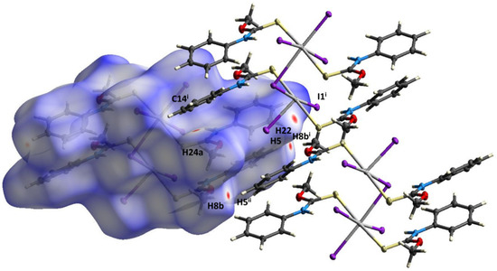 In the packing, several secondary weak interactions are present such as between atoms I1i–H22 (3.081 Å), C14i–H24A (2.757 Å), H5–H8Bi (2.293 Å) and I3i–H29 (3.128 Å). Furthermore, as shown in Figure 3, loose intramolecular S···H and N···H contacts occur.