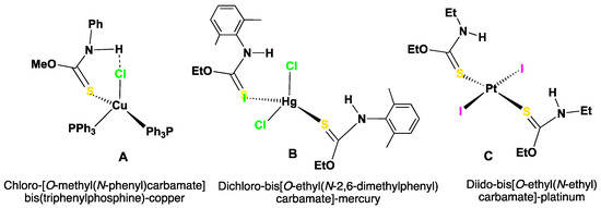 Examples of some O-alkyl N-aryl(or alkyl) thiocarbamate complexes.