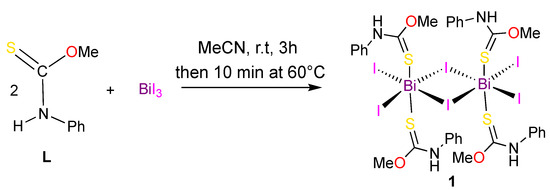 Surprisingly, despite the growing number of transition metal complexes bearing such type of thione ligands, there is a lack of p block metal complexes coordinated with O-alkyl N-aryl thiocarbamates. Since BiX3 complexes with thione-type ligand are literature-known (see below) and may even display a biological activity [10,11,12], we reacted BiI3 with O-methyl N-phenyl thiocarbamate and describe therein the crystal structure of the isolated complex. This research is a continuation of our investigations on the coordination chemistry of thione-type ligand on diverse metal centers [13,14,15,16].