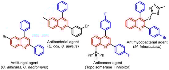 Quinoline and its derivatives are of imperative significance to medicinal and agricultural chemistry, exhibiting a broad array of exciting biological properties [1,2,3,4,5]. In particular, diaryl-substituted quinoline scaffolds are an integral component of various bioactive agents, displaying a wide range of biological activity, such as antithyroid cancer, antifungal, analgesic, antimalarial, antibacterial, anti-inflammatory, anti-tuberculosis, and antiproliferative activity, as well as inhibitory properties against a diverse set of important enzyme targets, such as EGFR/FAK kinase, Human Ecto-5′-nucleotidase, cyclooxygenase-2, etc. [6,7,8,9,10,11]. Among them, 2,4-diarylquinolines have been proven to be especially important because of their potential biological activity (Figure 1) [12,13,14,15,16]. Besides pharmacological activity, compounds containing a diarylquinoline substructure have found many applications in functional material chemistry [17,18,19,20,21].