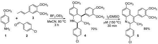 Synthesis of 2-(4-chlorophenyl)-4-(3,4-dimethoxyphenyl)-6-methoxy-3-methylquinoline (5) from commercially available p-anisidine (1), p-chlorobenzaldehyde (2), and methyl isoeugenol (3) using Povarov cycloaddition reaction/oxidative dehydrogenation aromatization sequence.