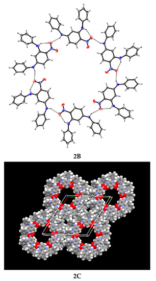 2A Drawing of 2,4-(phenylamino)nitrobenzene; 2B A cross section of the crystal structure showing the hexameric hydrogen-bonded units of compound 2 leaving a large hole or channel; 2C Packing diagram of compound 2 showing the large pores.