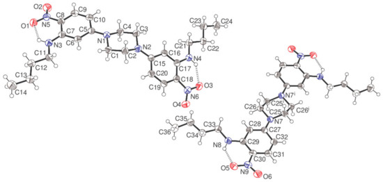 In compound 1, the butyl side chains pack forming a channel stabilised by two different hydrogen bonds. One intramolecular bifurcated hydrogen bond forms from the butylamino group to the nitro group and an intermolecular bifurcated hydrogen bond forms to the nitro group from the NH hydrogen atom of the diaminobutane side chain. These hydrogen bonds stabilise the packing.