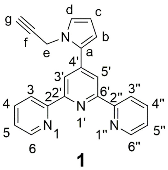 The molecular structure of compound 1 was unambiguously confirmed by different analytical techniques. First, the 1H-NMR spectrum (Supplementary Material) exhibits the typical signals for the terpyridine and pyrrole sub-units as reported for other pyrrole-terpys [6,13,14,22,23]. Moreover, the acetylenic protons were characterized by a triplet and a doublet (J = 2.6 Hz) centered at 2.45 and 4.91 ppm, respectively. These chemical shifts and/or multiplicities also agree with those previously reported for other N-propargylated pyrroles [24,25]. The 13C-NMR spectrum exhibits 15 peaks, which fully agree with the proposed structure for 1.