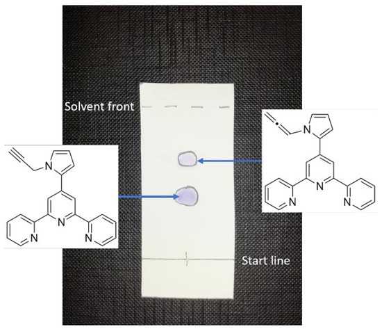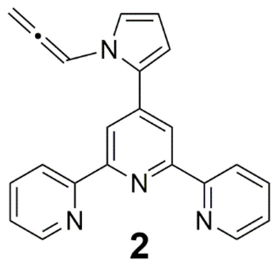 A tentative synthesis of 1 through N-propargylation of 4′-(pyrrol-2-yl)-2,2′:6′,2′′-terpyridine is already reported in the literature [13]. The synthetic pathway that was explored relies on the N-alkylation of the pyrrole ring with propargyl bromide in a strong basic medium [14]. Nevertheless, this approach failed in providing 1, and only isomeric 4′-(N-(propan-1,2-dienyl)pyrrol-2-yl)-2,2′:6′,2′′-terpyridine 2 was obtained (Figure 2). This can be explained by the strong basic conditions (potassium hydroxide in dimethylsulfoxide is a superbase [15]) of the reaction which result in isomerization of the triple bond. Therefore, another synthetic strategy was developed in the present research to obtain compound 1.