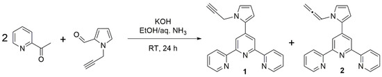 Many synthetic protocols are available for the preparation of terpyridines [16,17,18], most of them being based on Krohnke’s method [19]. Here, the reaction between 2-acetylpyridine and N-propargylpyrrole-2-carboxaldehyde [20] in the presence of potassium hydroxide and aqueous ammonia in ethanol [21] was selected (Figure 3).