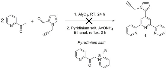 To reduce the amount of undesired compound 2, one experiment was carried out using an even weaker base. For this, N-propargylpyrrole-2-carboxaldehyde was reacted with 2-acetylpyridine and basic alumina under solventless conditions as already described for the preparation of other terpyridine derivatives [26]. Unfortunately, no trace of a terpyridine product was noticed under these conditions (Figure 5).