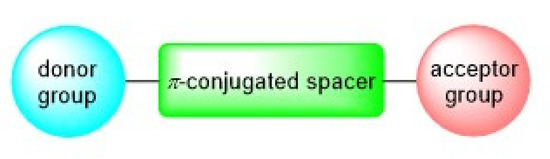 Push–pull chromophores, in which electron donor and electron acceptor groups are connected through a π-conjugated system (Figure 1), are the subject of considerable research interest in material science due to their unique properties (color, electrochemical, photochemical and solvatochromic behavior, nonlinear optical (NLO) properties, etc.) [1,2,3,4,5].