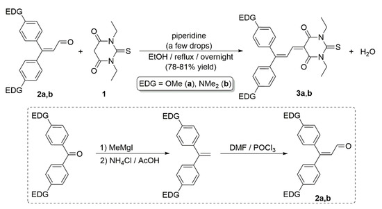 A wide variety of donor and acceptor units, as well as π-conjugated spacers, have been combined during the last decades for the construction of push–pull molecules. In this context, the pseudoaromatic 2-thioxodihydropyrimidine-4,6(1H,5H)-dione ring of thiobarbituric acid and its N-alkylated derivatives has been extensively employed as an electron-withdrawing moiety in push–pull chromophores [6,7,8,9]. Representative examples are dyes 3a,b, recently described by Dumur and co-workers, featuring p-methoxyphenyl and p-dimethylaminophenyl donor groups connected to the barbituric acid skeleton through a 1,3-butadiene chain spacer (Scheme 1), which showed a marked solvatochromic behavior in solution [10,11]. As shown in Scheme 1, compounds 3a,b were obtained by Knoevenagel condensation of commercially available 1,3-diethyl-2-thiobarbituric acid 1 with the corresponding α,β-unsaturated aldehyde 2a,b in refluxing ethanol under basic conditions. For the preparation of enals 2a,b, Dumur and co-workers followed a classical synthetic route involving the initial olefination of the respective 4,4′-disubstituted benzophenone, and subsequent Vilsmeier formylation of the resulting 1,1-diarylethylenes (see Scheme 1).