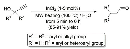 It is well known that α,β-unsaturated carbonyl compounds (both enals and enones) can be accessed, in a straightforward and atom-economical manner, through the catalytic Meyer–Schuster rearrangement of propargylic alcohols [12,13,14]. In this context, we developed some years ago an efficient, general and environmentally benign protocol for the Meyer–Schuster conversion of terminal propargylic alcohols into enals employing inexpensive InCl3 as the catalyst, water as solvent, and microwaves (MW) irradiation as the heating source (Scheme 2) [15].