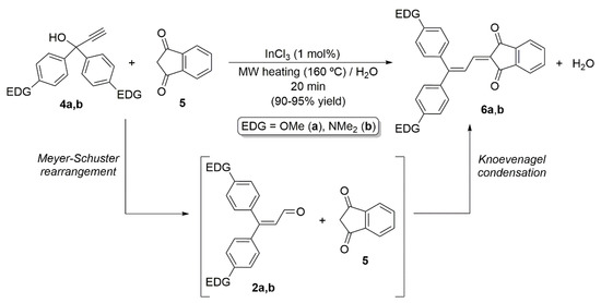 Additionally, in line with the interest of our group in the design of push–pull molecules [16,17], we demonstrated the utility of this MW-assisted InCl3-catalyzed reaction in the field with the high-yield synthesis of the donor-acceptor butadienes 6a,b, structurally related to 3a,b, by coupling of the corresponding propargylic alcohols 4a,b with indan-1,3-dione 5 [18] As shown in Scheme 3, under the reaction conditions employed, the Meyer–Schuster and Knoevenagel reactions run smoothly and successively in a one-pot manner. Taking advance of this previous work, herein we would like to communicate that Dumur’s dyes 3a,b can also be generated by direct MW-assisted InCl3-catalyzed coupling 1,3-diethyl-2-thiobarbituric acid 1 with alkynols 4a,b. In addition, the synthesis and spectroscopic characterization of the novel butadiene 5-(3,3-bi([1,1’-biphenyl]-4-yl)allylidene)-1,3-diethyl-2-thioxodihydropyrimidine-4,6(1H,5H)-dione 3c will be presented.